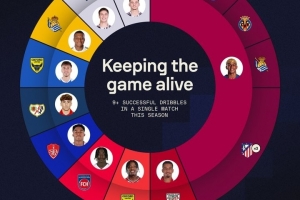 其中对阵马竞便有3场。而与此同时,五大联赛其他球员同期最多只有一场成功过人9+。
