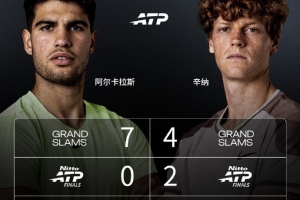 ATP官方对比了辛纳、阿尔卡拉斯两人重大冠军数量对比,辛纳在年终领先,在大满贯落后阿尔卡拉斯,大师赛两人打平。